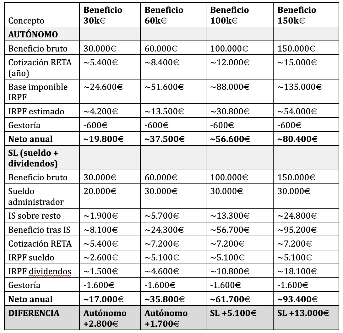 A partir de cierto nivel de beneficio, la doble capa de tributación (Impuesto de Sociedades + IRPF por dividendos) empieza a ser más eficiente que tributar todo directamente en IRPF.