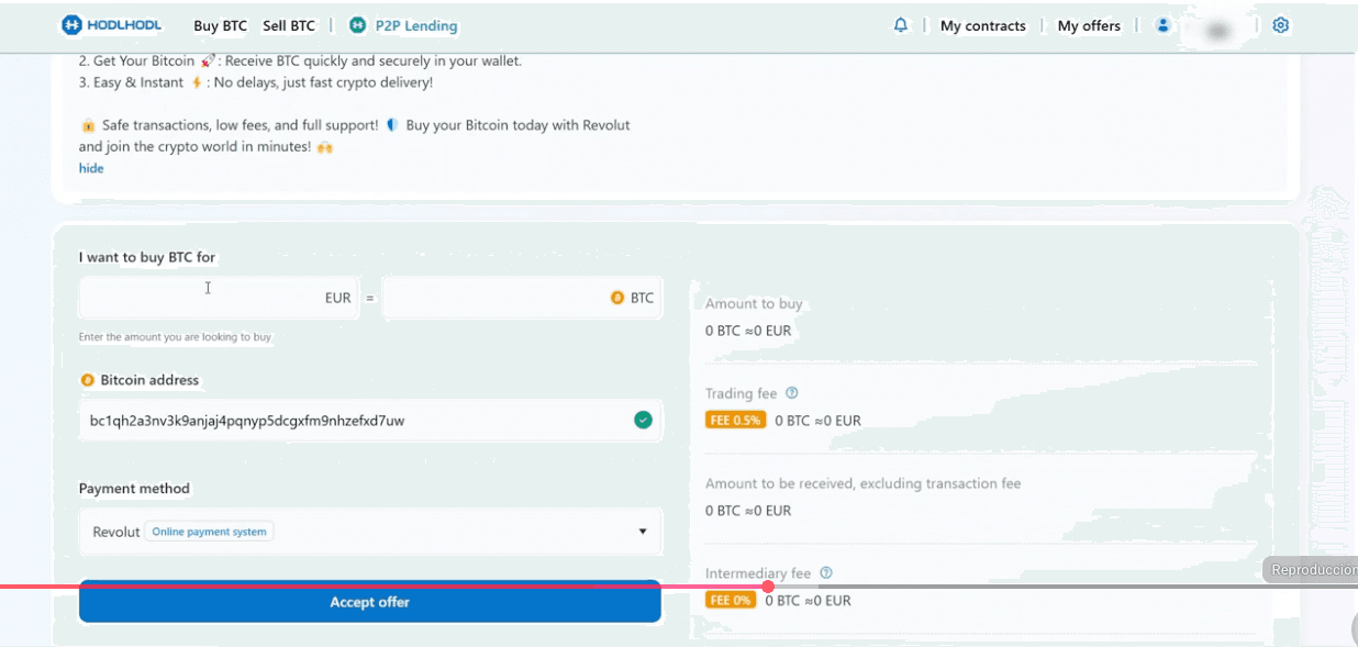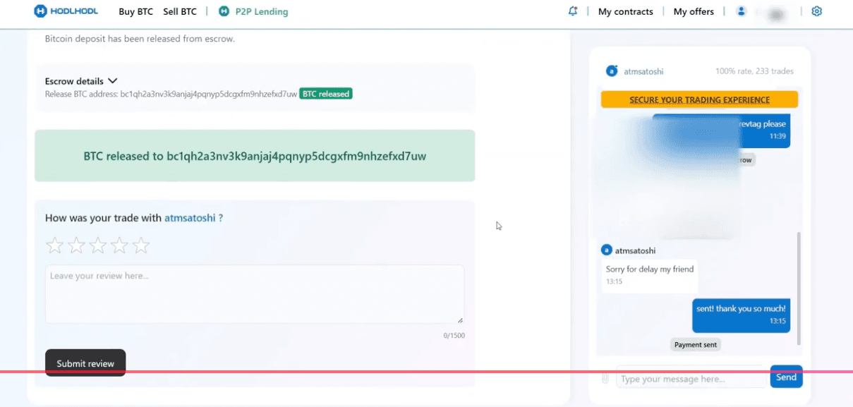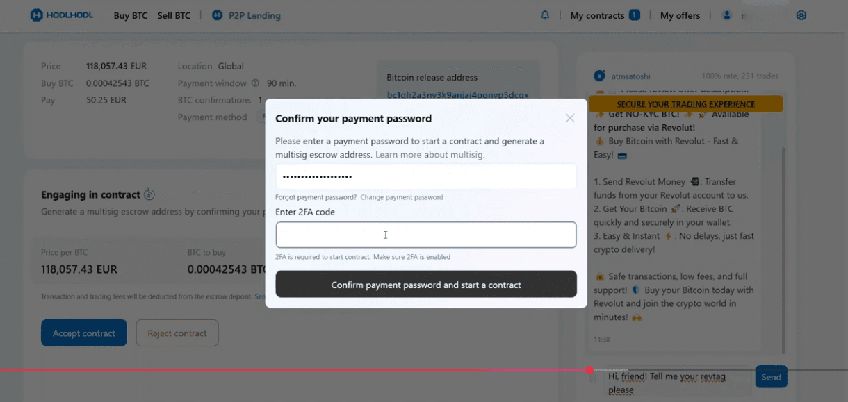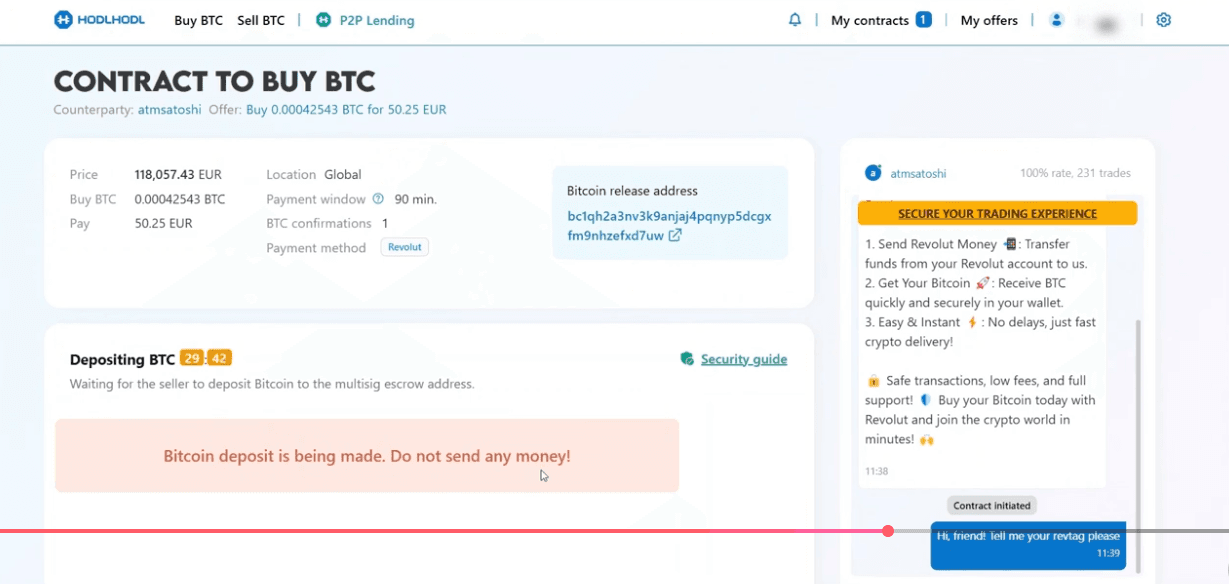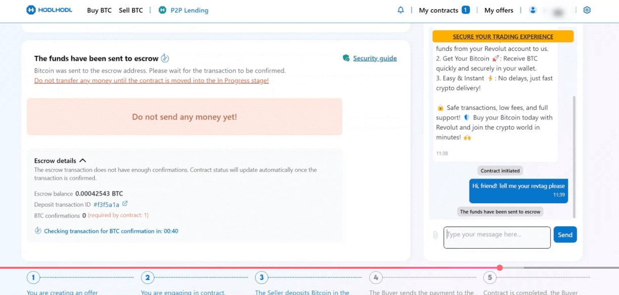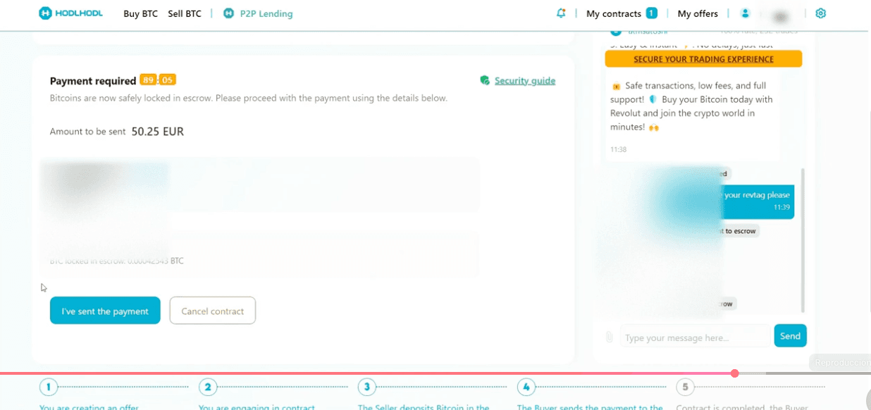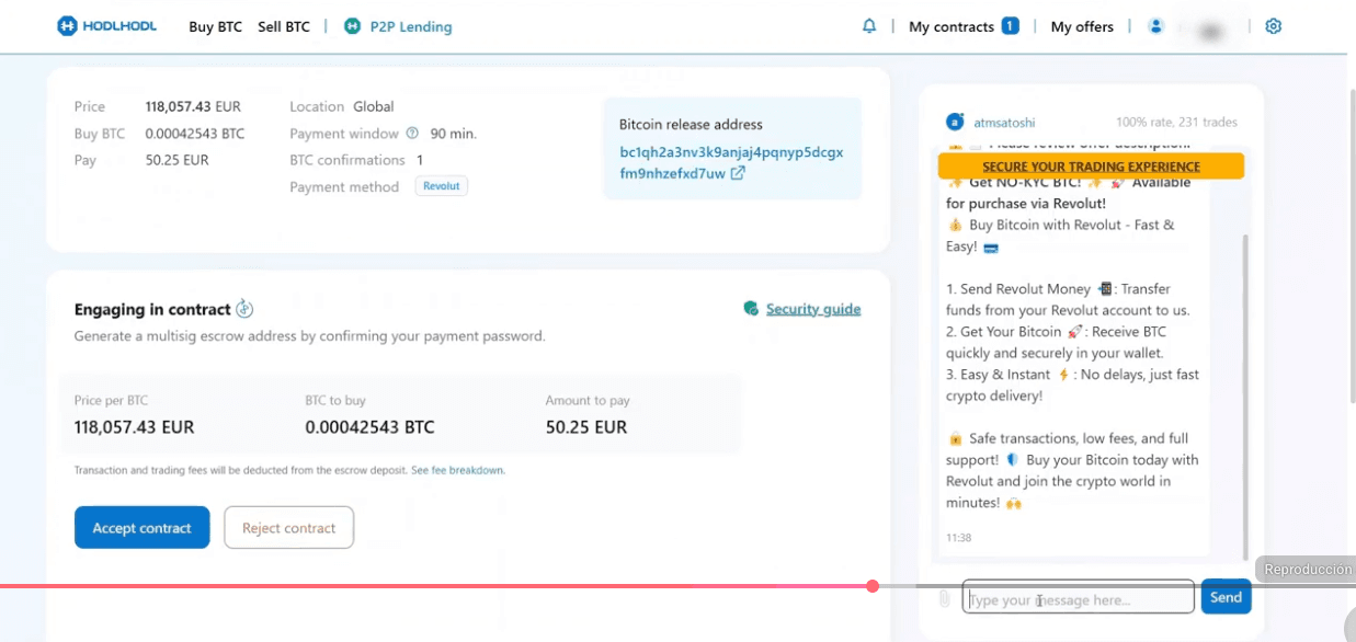 Cuando inicias el contrato, el vendedor ya ha depositado el Bitcoin en un escrow multifirma 2/3, donde queda bloqueado.