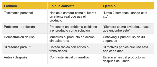 Hay formatos que funcionan mejor que otros porque se integran bien en anuncios de Meta o TikTok. Estos son los más demandados: